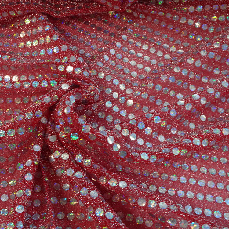 Polyester Jersey - 6mm Silver Hologram Sequin - On Red - 95cm Wide