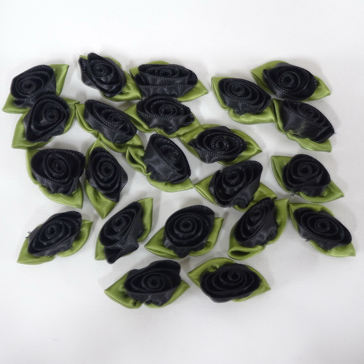 Large Black Satin Ribbon Roses With Green Satin Ribbon Leaves-