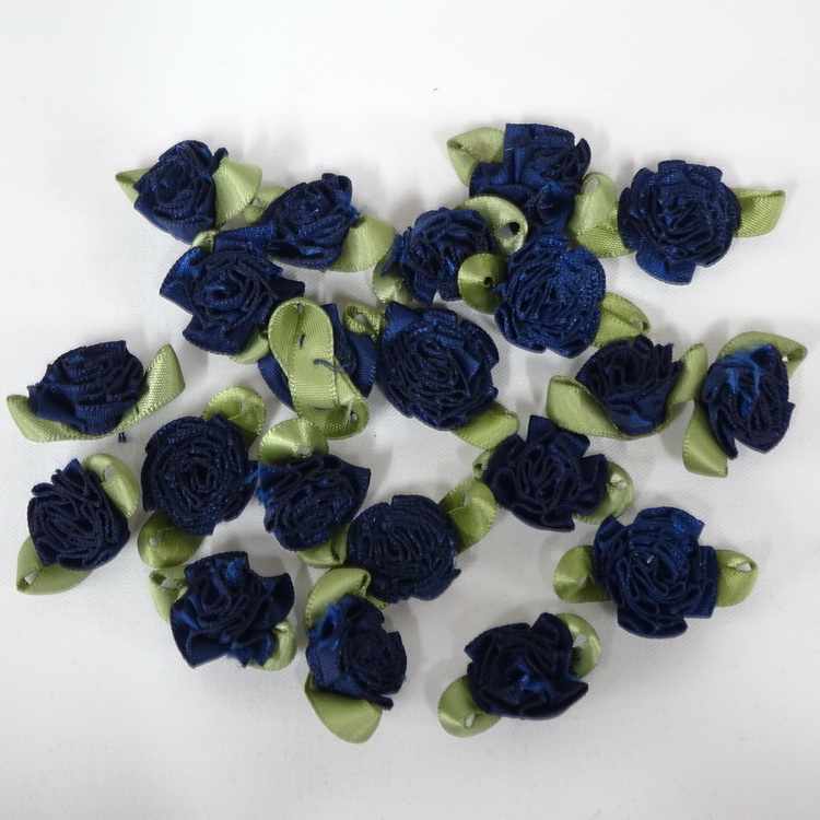 Large Navy Satin Ribbon Swirl Roses With Green Satin Ribbon Leaves-