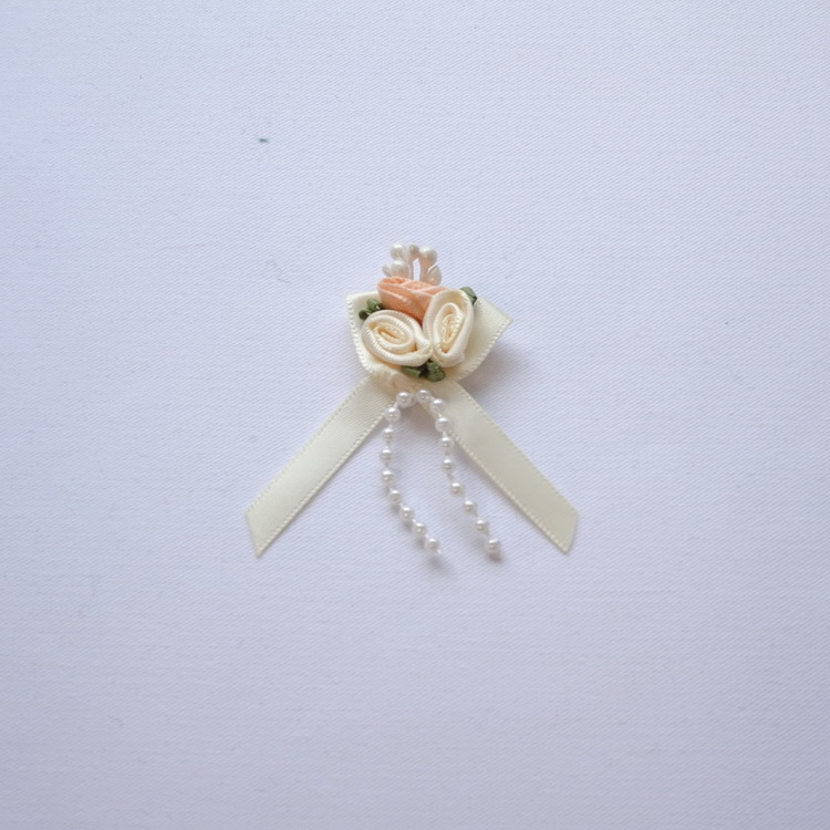 Cream And Peach Satin 3 Rose Ribbon Cluster - With 2 Pearl Strings - 25mm Across - 10 Per Pack