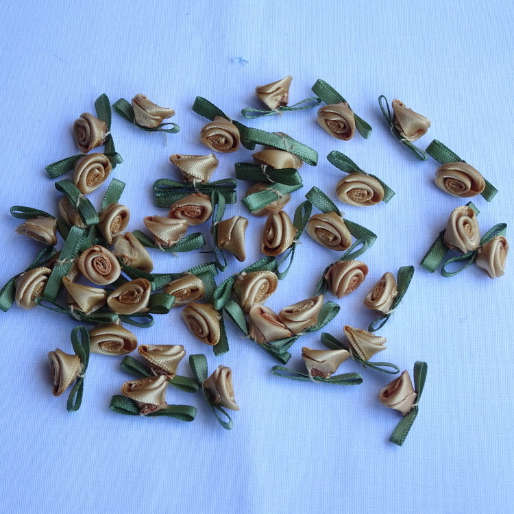 Small Gold Satin Ribbon Roses With Green Satin Ribbon Leaves-