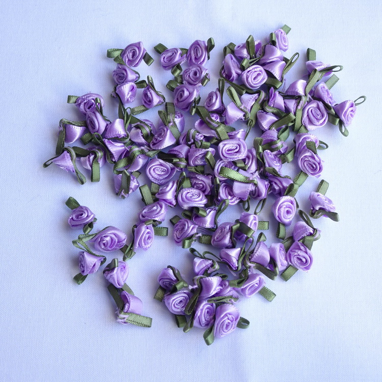 Small Lilac Satin Ribbon Roses With Green Satin Ribbon Leaves-