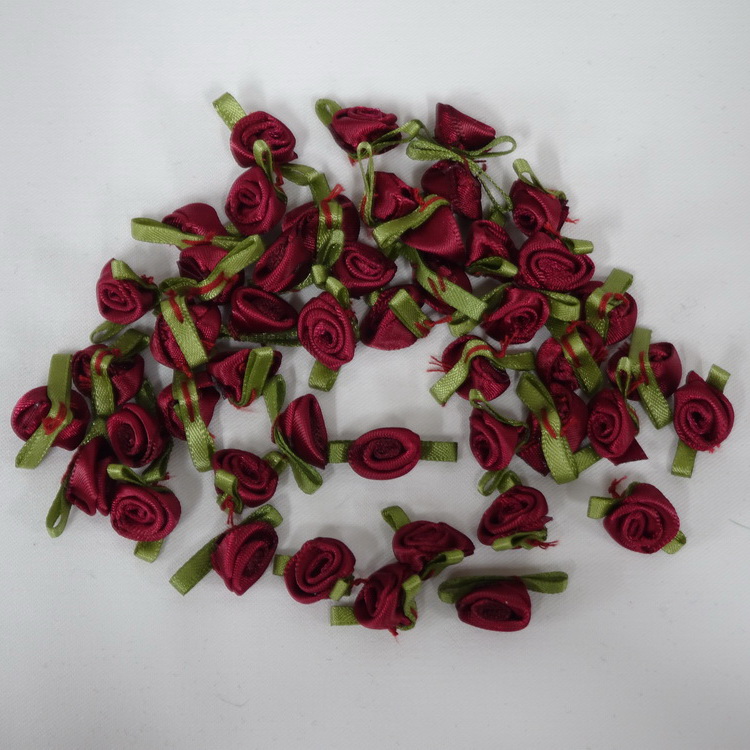 Small Wine Satin Ribbon Roses With Green Satin Ribbon Leaves-