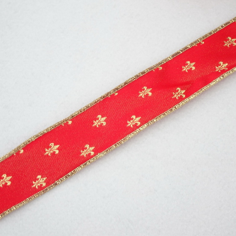 Wire Edged Ribbon - Fleur De Lis - Red With Gold - 35mm Wide